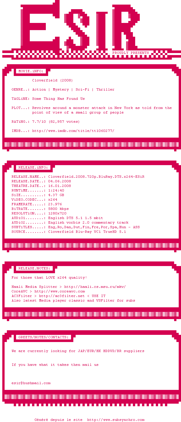 Voir le nfo de la release Cloverfield.2008.720p.BluRay.x264-ESiR