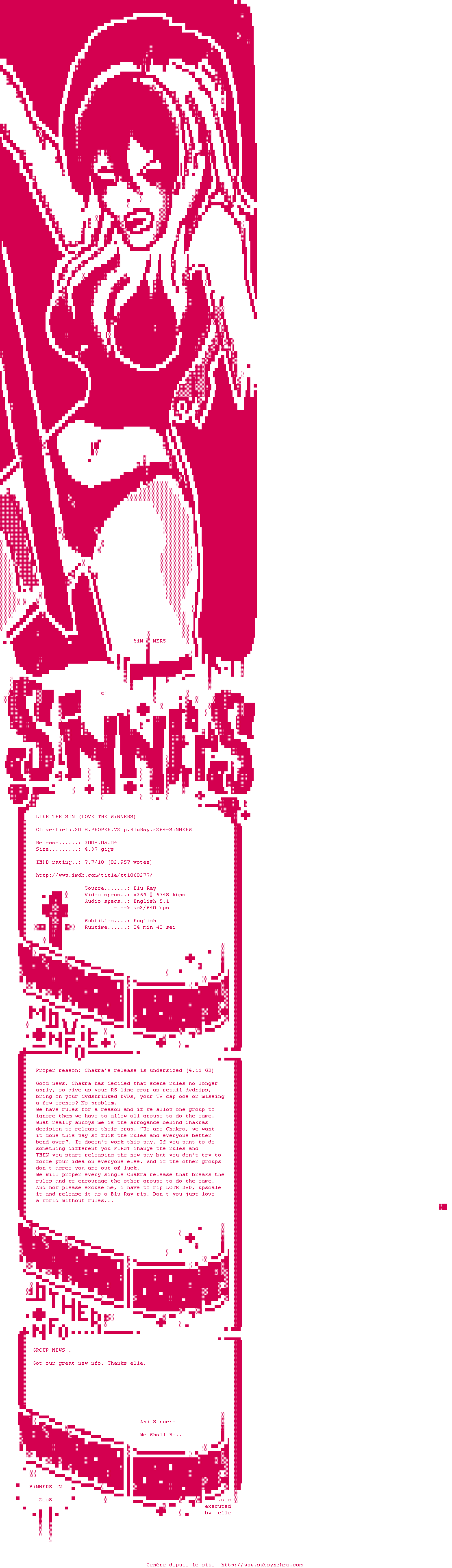 Voir le nfo de la release Cloverfield.2008.PROPER.720p.BluRay.x264-SiNNERS