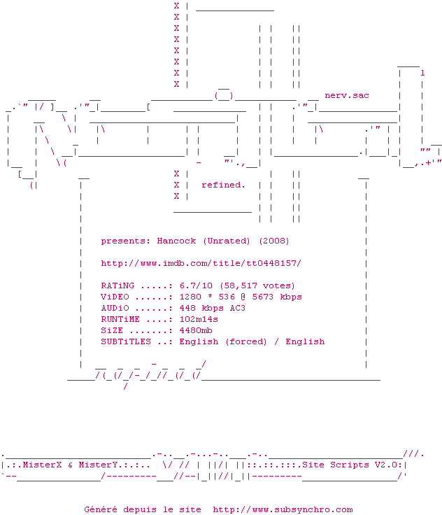 Voir le nfo de la release Hancock.2008.EXTRAS.1080p.BluRay.H264-RMXTRAS