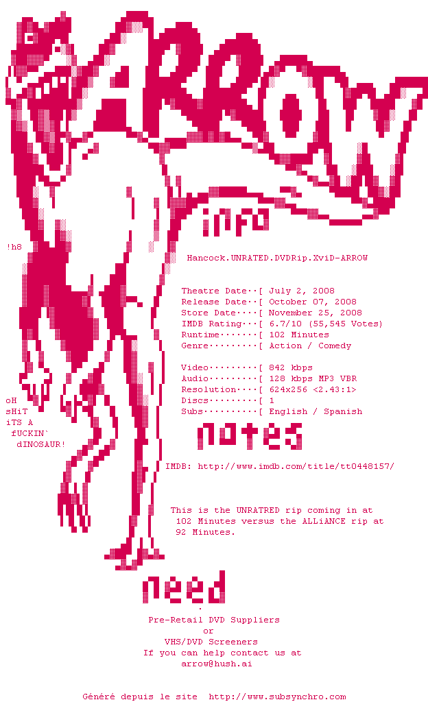Voir le nfo de la release Hancock.UNRATED.DVDRip.XviD-ARROW
