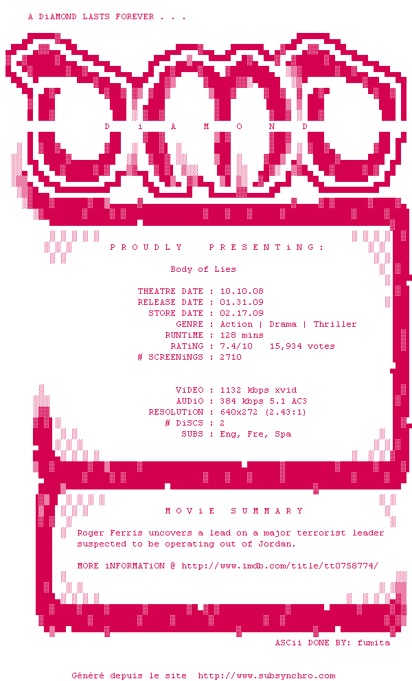 Un excellent film d'espionnage, Ridley Scott est au mieux de son talent avec ce film sur fond du 11 septembre. Et Leonardo DiCaprio est impeccable (comme d'habitude).