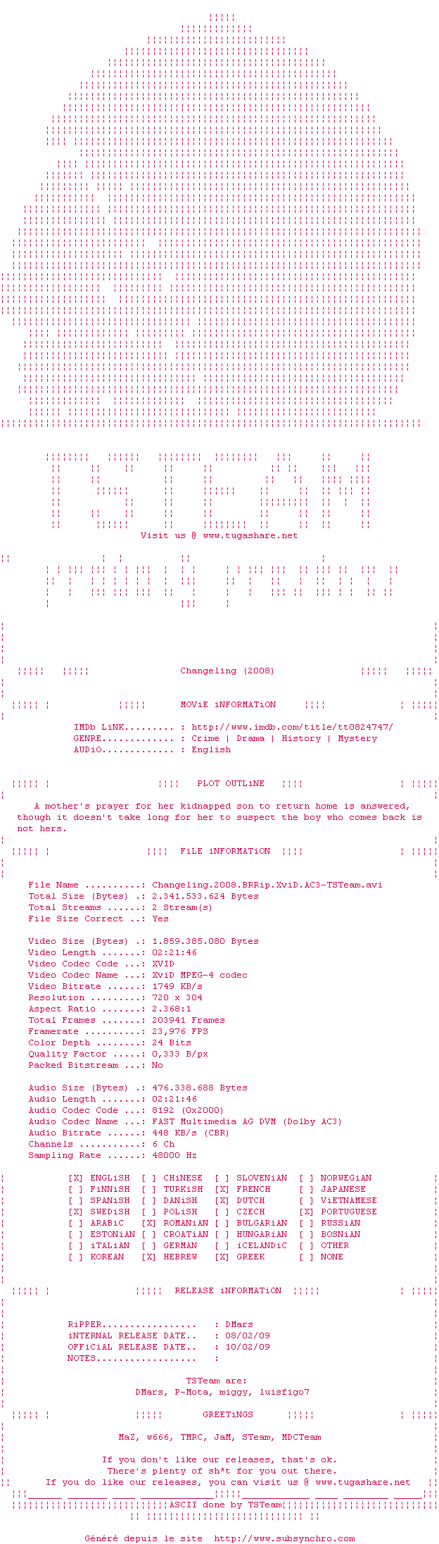 Voir le nfo de la release Changeling.2008.BRRip.XviD.AC3-TSTeam