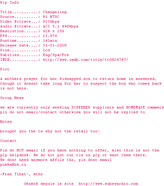 Voir le nfo de la release Changeling.2008.BRRip.XviD.AC3-D-Z0N3