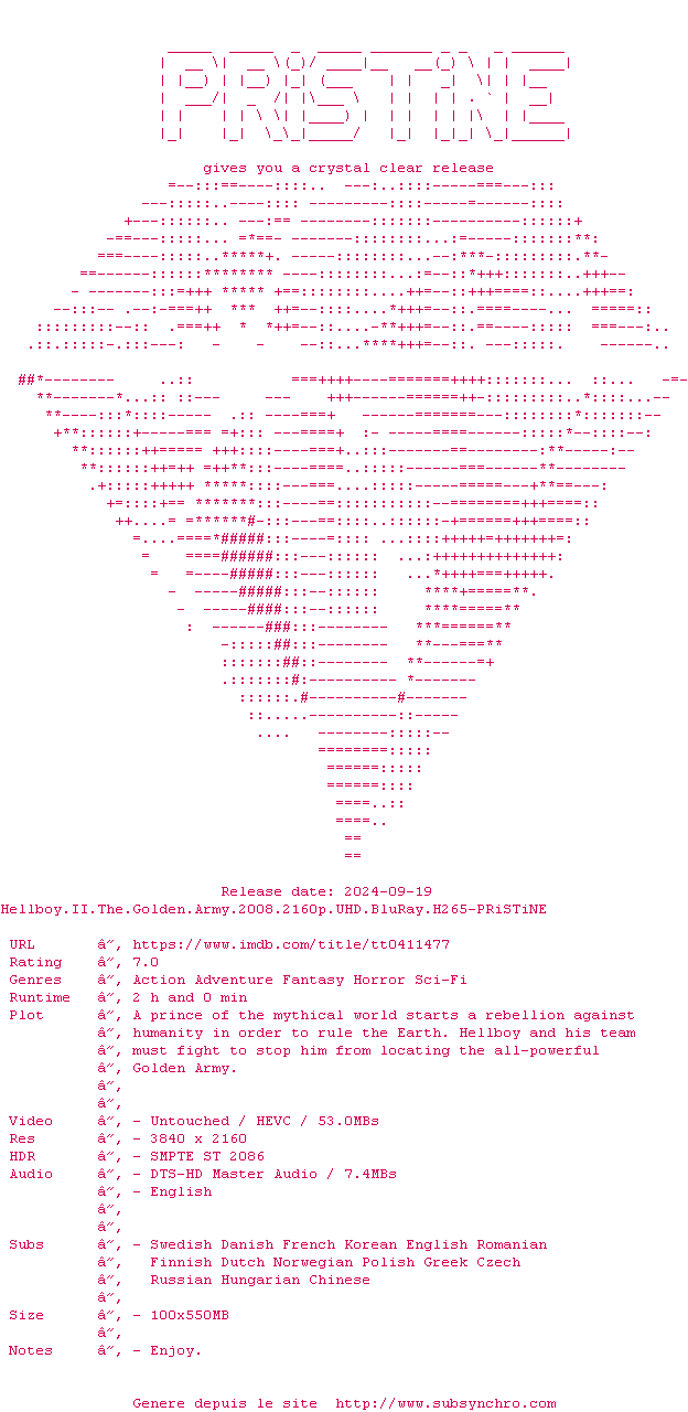 Voir le nfo de la release Hellboy.II.The.Golden.Army.2008.2160p.UHD.BluRay.H265-PRiSTiNE