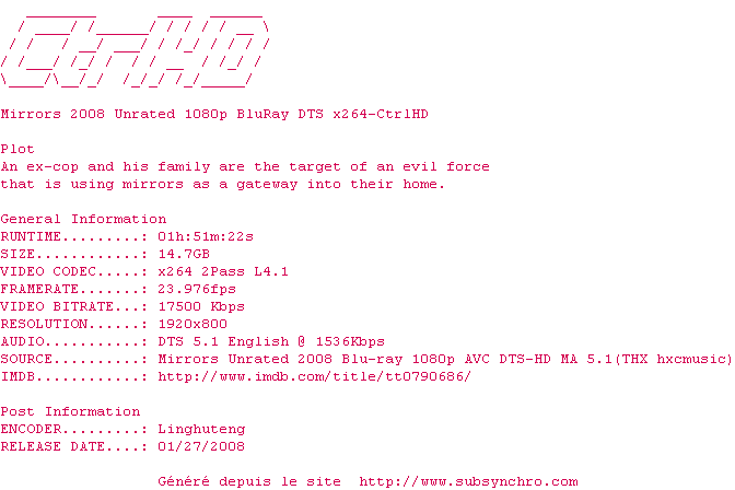 Voir le nfo de la release Mirrors.2008.Unrated.1080p.BluRay.DTS.x264-CtrlHD