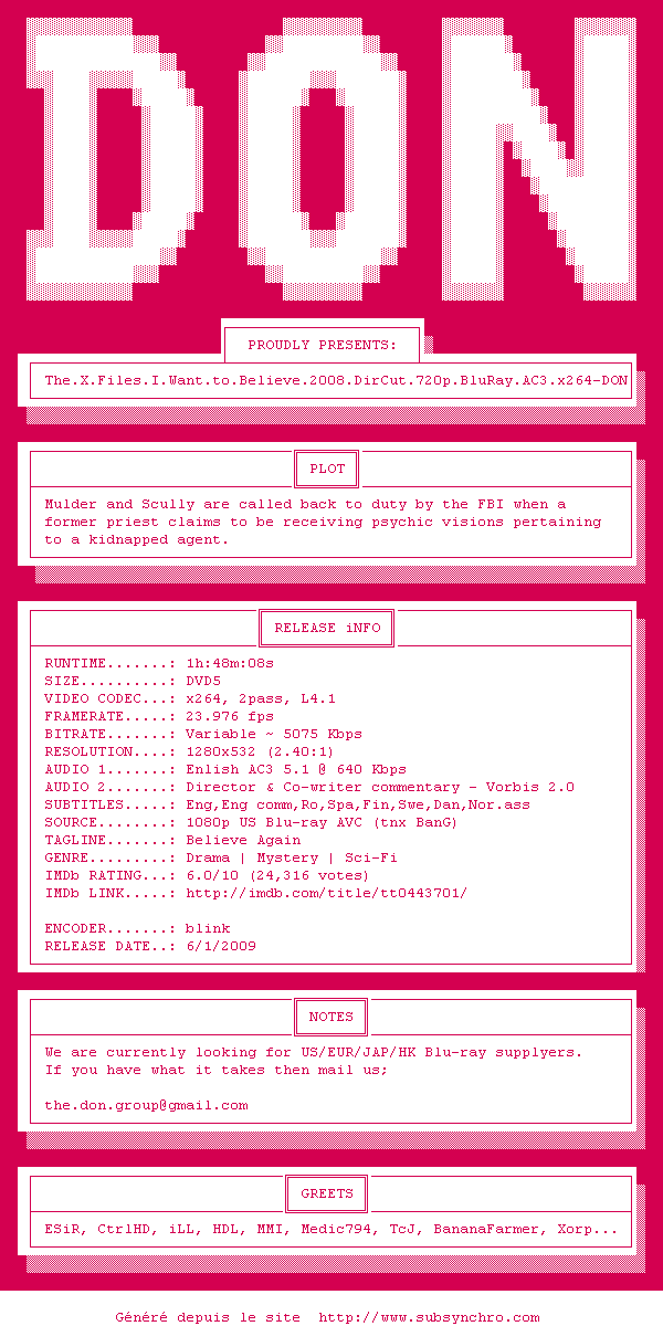 Voir le nfo de la release The.X.Files.I.Want.to.Believe.2008.DirCut.720p.BluRay.AC3.x264-DON