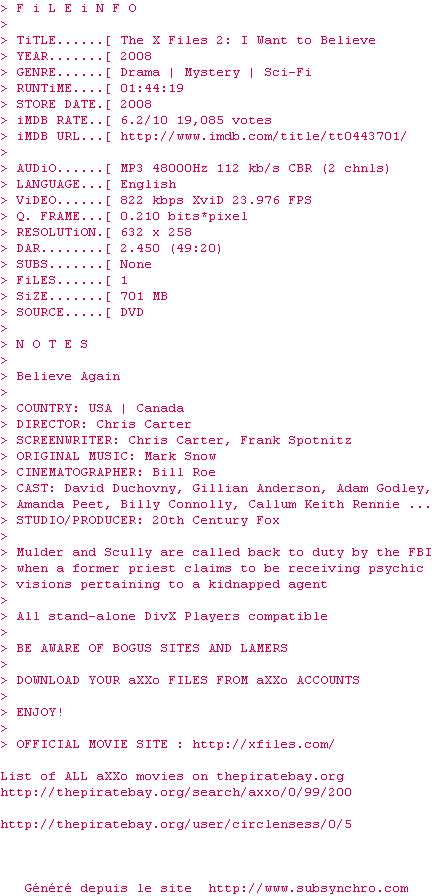 Voir le nfo de la release The.X.Files.I.Want.To.Believe.2008.DvDrip-aXXo