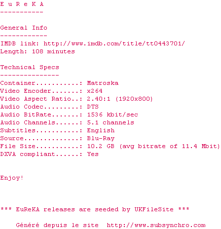 Voir le nfo de la release The.X.Files.I.Want.to.Believe.DC.2008.BluRay.1080p.DTS.x264.dxva-EuReKA
