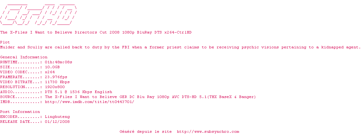 Voir le nfo de la release The.X.Files.I.Want.to.Believe.Directors.Cut.2008.1080p.BluRay.DTS.x264-CtrlHD