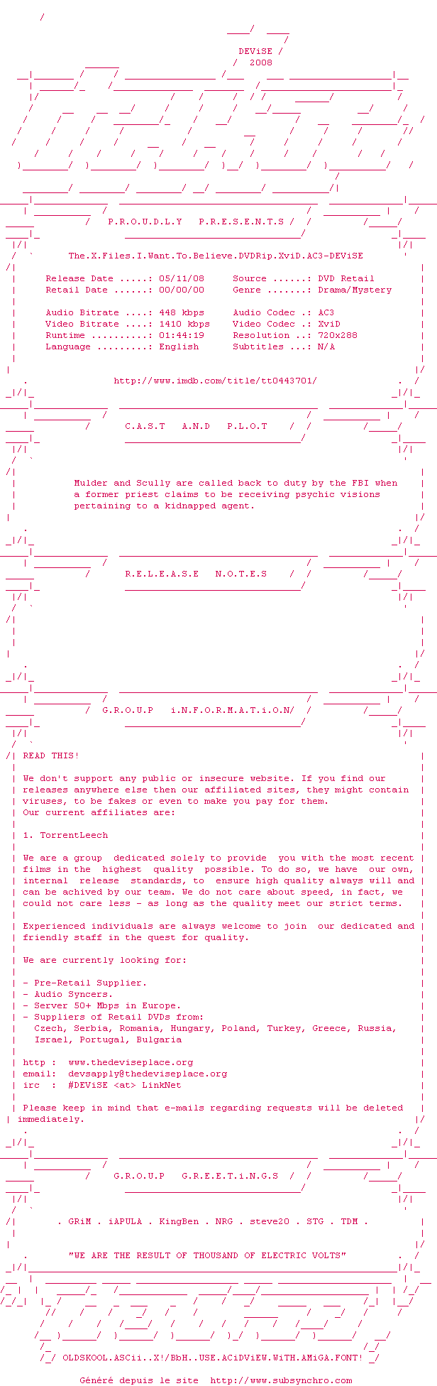 Voir le nfo de la release The.X.Files.I.Want.To.Believe.DVDRip.XviD.AC3-DEViSE