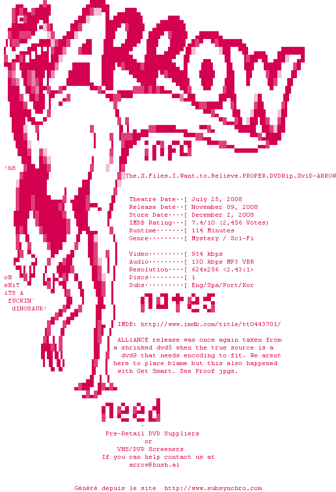 Voir le nfo de la release The.X.Files.I.Want.to.Believe.PROPER.DVDRip.XviD-ARROW