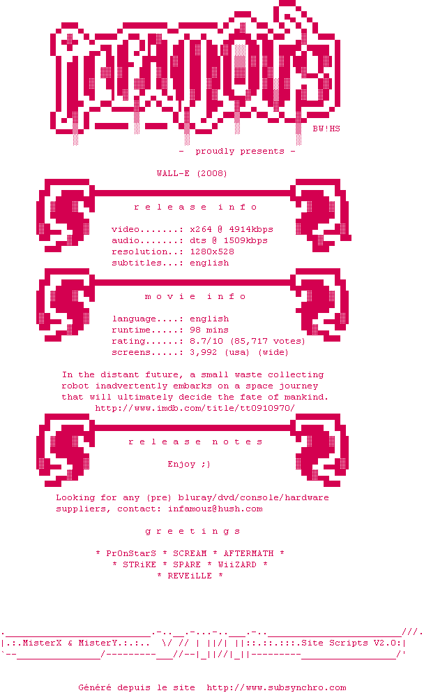 Pour moi, peut-être le meilleur film d'animation toutes époques et nationalités confondues, plein de poésie et de symbolique, un humour à la fois simple et subtil. Une bande-son exceptionnelle. Le meilleur de Pixar, sans aucun doute, de par sa simplicité et son travail incroyable de l'image et du rythme, appréciez-le en Bluray si vous le pouvez.