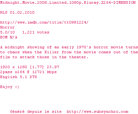 Voir le nfo de la release Midnight.Movie.2008.Limited.1080p.Bluray.X264-DIMENSION