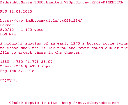 Voir le nfo de la release Midnight.Movie.2008.Limited.720p.Bluray.X264-DIMENSION