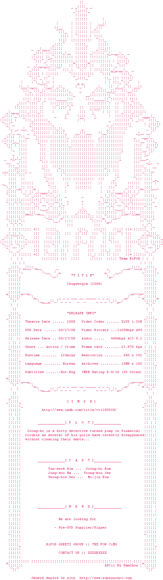 | Voir le nfo de la release Chaser.2008.DVDRip.XviD-BiFOS | BiFOS | Chaser.2008.DVDRip.XviD-BiFOS OpenSubtitles | 0 fichier | ||