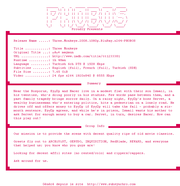 | Voir le nfo de la release Three.Monkeys.2008.1080p.BluRay.x264-PHOBOS | PHOBOS | Three.Monkeys.2008.1080p.BluRay.x264-PHOBOS OpenSubtitles | 0 fichier | ||