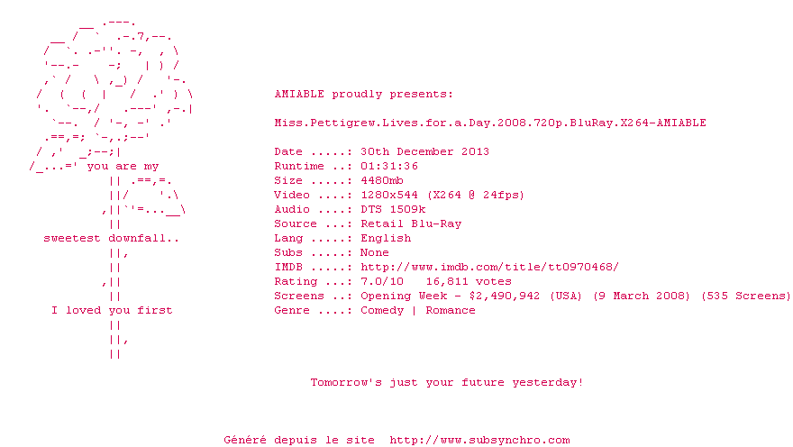 Voir le nfo de la release Miss.Pettigrew.Lives.for.a.Day.2008.1080p.BluRay.X264-AMIABLE