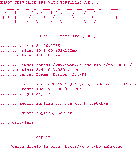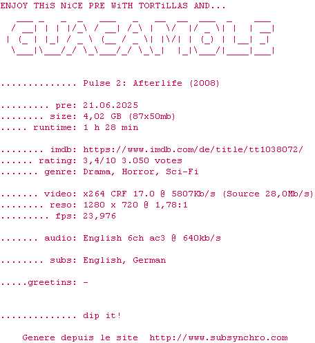 Voir le nfo de la release Pulse.2.Afterlife.2008.720p.BluRay.x264-GUACAMOLE