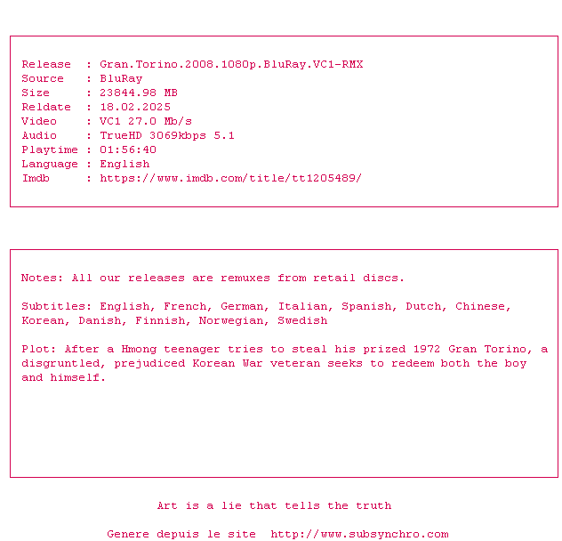 Voir le nfo de la release Gran.Torino.2008.EXTRAS.1080p.BluRay.VC1-RMXTRAS