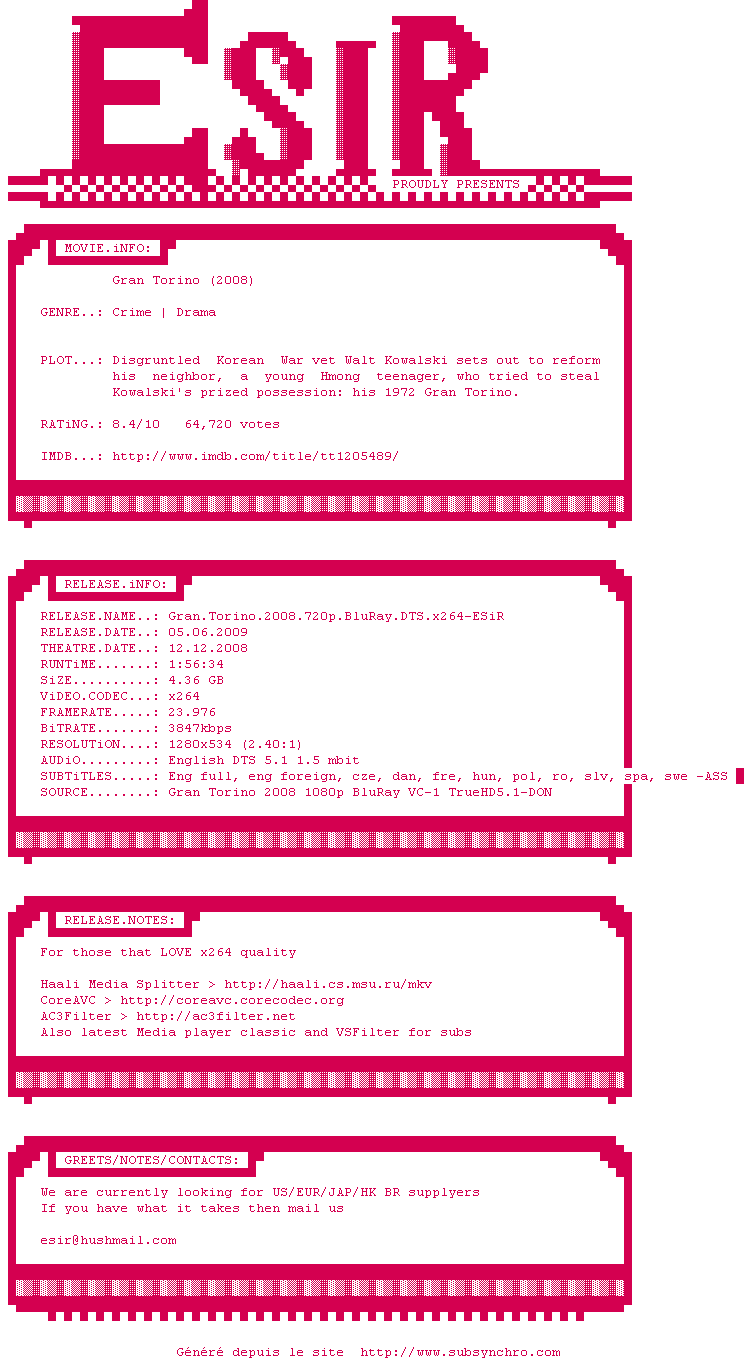 Voir le nfo de la release Gran.Torino.2008.720p.BluRay.DTS.x264-ESiR