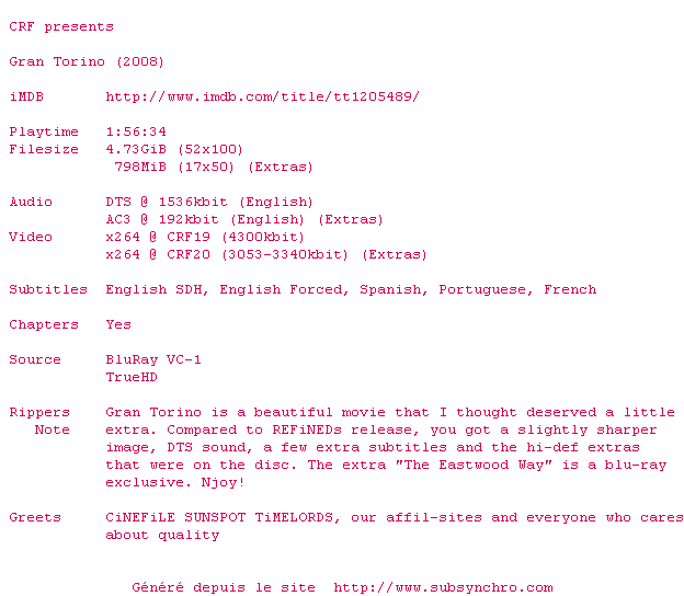 Voir le nfo de la release Gran.Torino.2008.720p.BluRay.x264.iNTERNAL-CRF