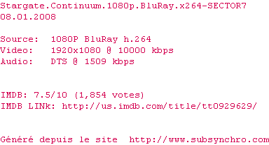 Voir le nfo de la release Stargate.Continuum.1080p.BluRay.x264-SECTOR7