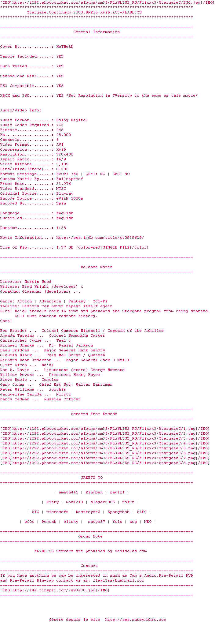 Voir le nfo de la release Stargate.Continuum.2008.BRRip.XviD.AC3-FLAWL3SS