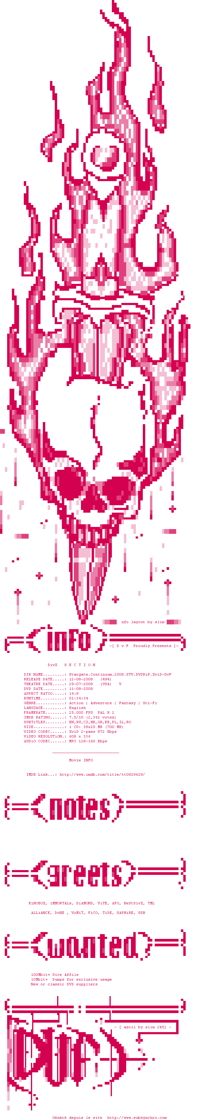 Voir le nfo de la release Stargate.Continuum.2008.STV.DVDRiP.XviD-DvF