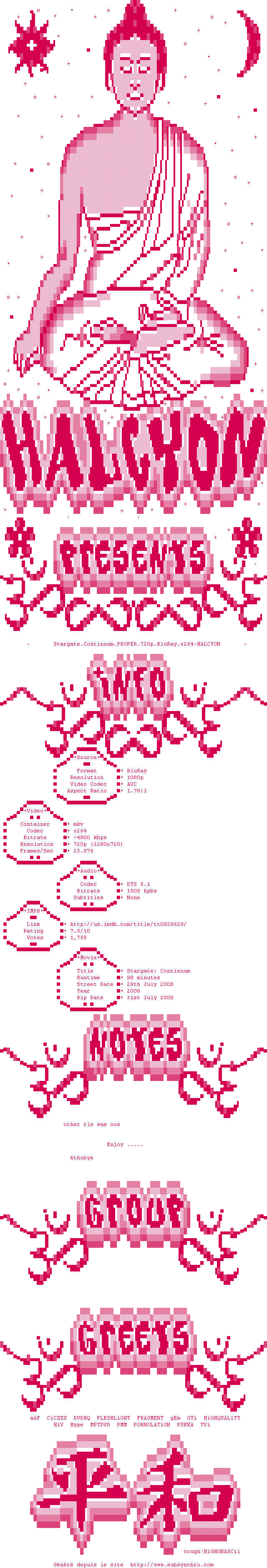 Voir le nfo de la release Stargate.Continuum.PROPER.720p.BluRay.x264-HALCYON