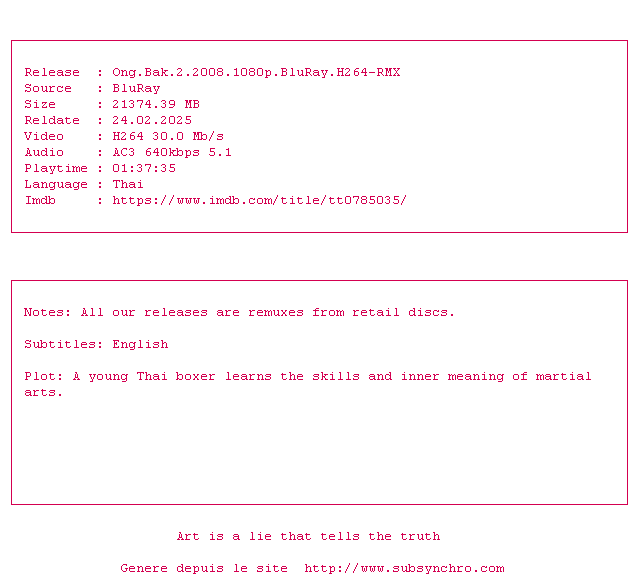 | Voir le nfo de la release Ong.Bak.2.2008.1080p.BluRay.H264-RMX | RMX | Ong.Bak.2.2008.1080p.BluRay.H264-RMX OpenSubtitles | 0 fichier |