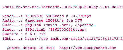 Telechargez le RSS « Fichier de la release Achilles.And.The.Tortoise.2008.720p.BluRay.x264-USURY »