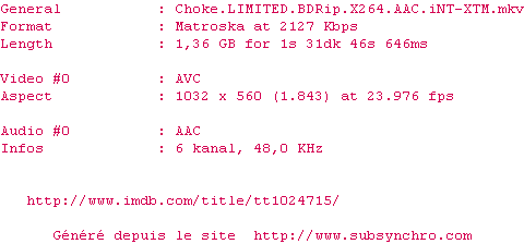 Telechargez le RSS « Fichier de la release Choke.LIMITED.BDRip.X264.AAC.iNT-XTM »