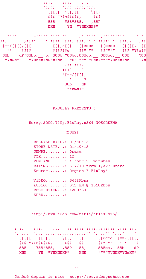 Telechargez le RSS « Fichier de la release Mercy.2009.720p.BluRay.x264-NOSCREENS »