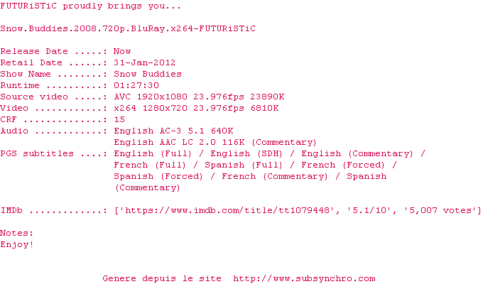 Telechargez le RSS « Fichier de la release Snow.Buddies.2008.720p.BluRay.x264-FUTURiSTiC »