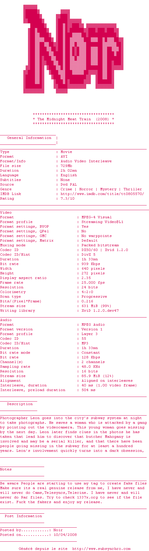 The-Midnight-Meat-Train.2008..R5..Eng.Xvid.1337x-Noir.srt Ajouté par Nuclear Ajoute le 07-08-2011 20:48:22 Format : SRT Italique : Non Taille : 0.00Ko Telechargement : 95 Votez pour valider ! Ajouter cette release à ma collection en cas de telechargement des sous-titres 0 0 0 Telecharger le ZiP contenant NFO, Affiche, Sous-titre (*.srt) Commentez le fichier The-Midnight-Meat-Train.2008..R5..Eng.Xvid.1337x-Noir.srt Commentez le fichier The-Midnight-Meat-Train.2008..R5..Eng.Xvid.1337x-Noir.srt Commentez ce fichier Le fichier 2480-1312742923.srt n'existe pas ! Telechargez le RSS « Fichier de la release The.Midnight.Meat.Train.2008.R5.Xvid-Noir » Retour au film « Midnight Meat Train »