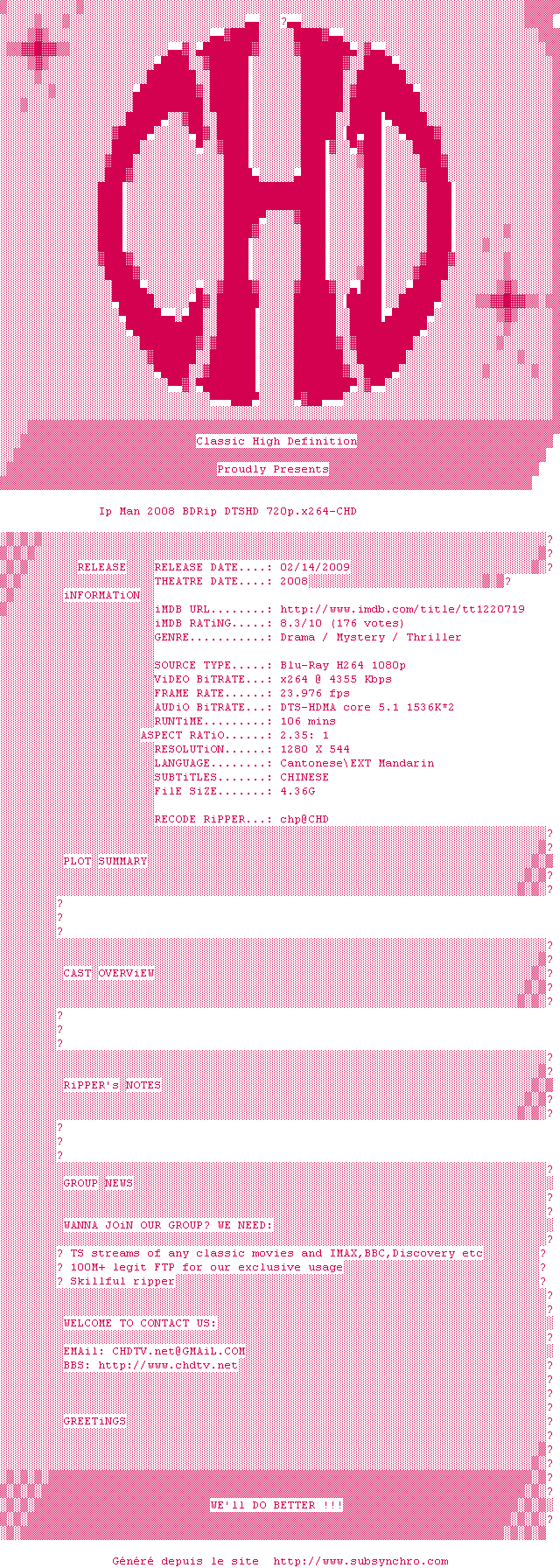 Telechargez le RSS « Fichier de la release Ip.Man.2008.BDRip.720p.x264.DTSHD.DualAudio-CHD »