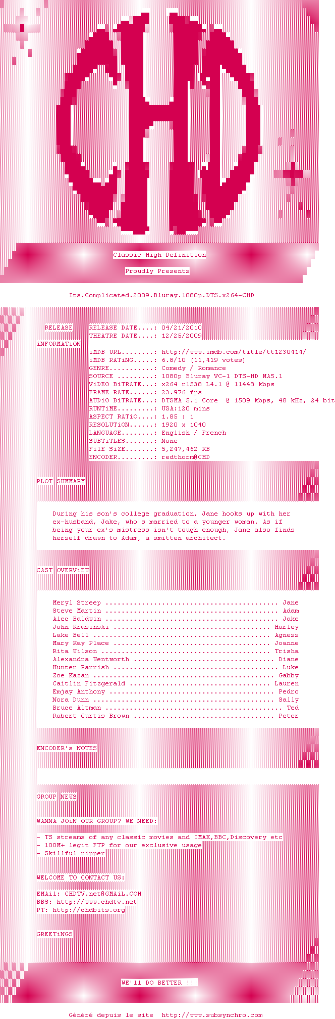 Voir le nfo de la release Its.Complicated.2009.Bluray.1080p.DTS.x264-CHD