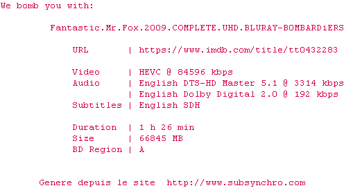 Voir le nfo de la release Fantastic.Mr.Fox.2009.2160p.UHD.BluRay.x265-B0MBARDiERS