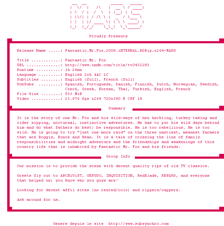 Voir le nfo de la release Fantastic.Mr.Fox.2009.iNTERNAL.BDRip.x264-MARS