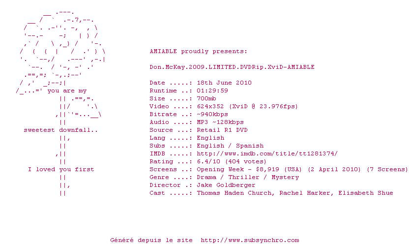 | Voir le nfo de la release Don.McKay.2009.LIMITED.DVDRip.XviD-AMIABLE | AMIABLE | Don.McKay.2009.LIMITED.DVDRip.XviD-AMIABLE OpenSubtitles | 0 fichier | ||