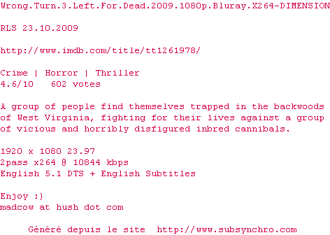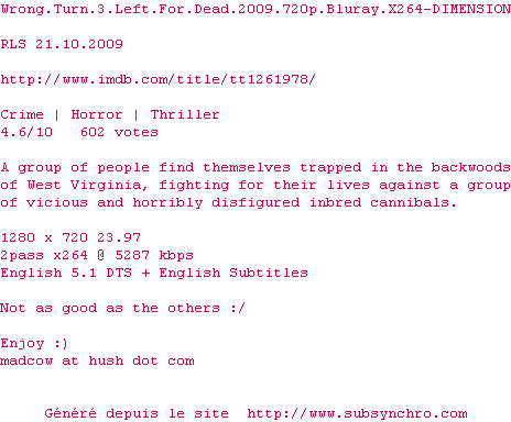 Voir le nfo de la release Wrong.Turn.3.Left.For.Dead.2009.720p.Bluray.X264-DIMENSION