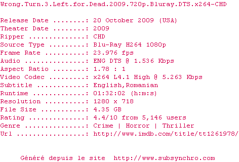 Voir le nfo de la release Wrong.Turn.3.Left.for.Dead.2009.720p.Bluray.DTS.x264-CHD