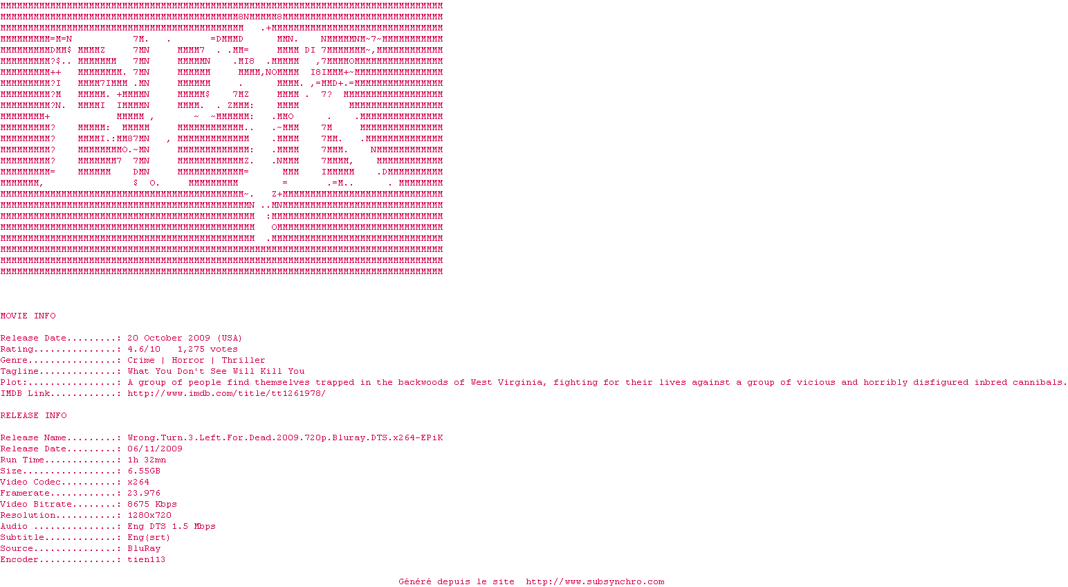Voir le nfo de la release Wrong.Turn.3.Left.For.Dead.2009.720p.Bluray.DTS.x264-EPiK