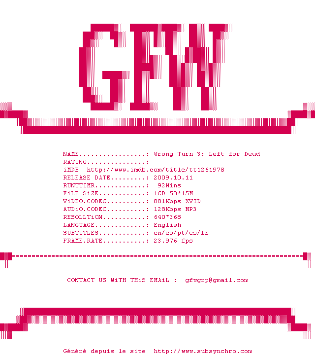 Voir le nfo de la release Wrong.Turn.3.Left.for.Dead.2009.STV.DVDRip.XviD-GFW