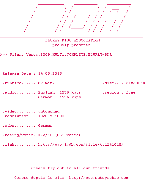 Voir le nfo de la release Silent.Venom.2009.MULTi.COMPLETE.BLURAY-BDA