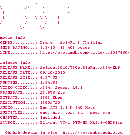 Voir le nfo de la release Splice.2010.720p.BluRay.x264-EbP