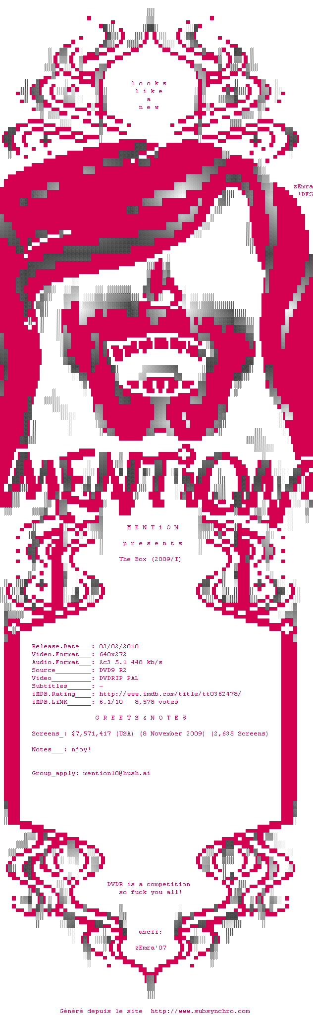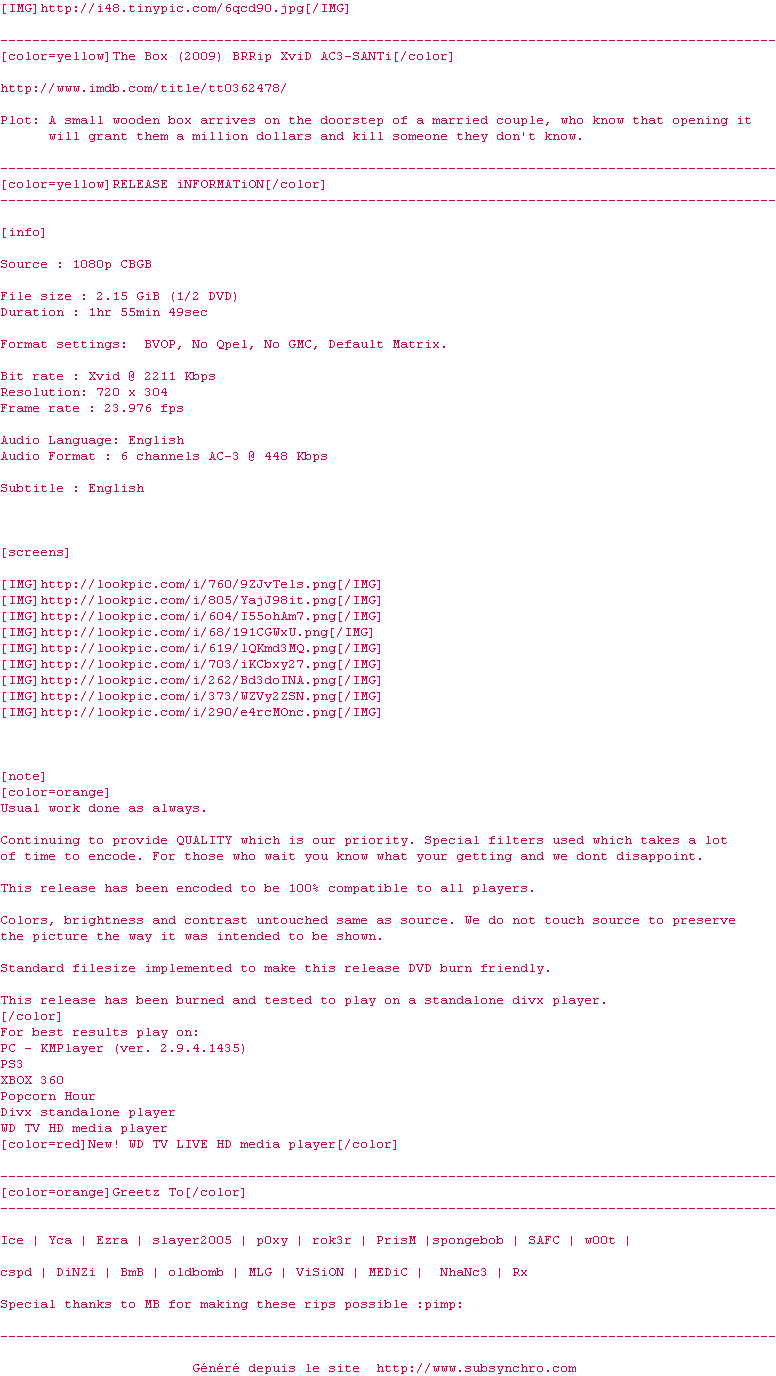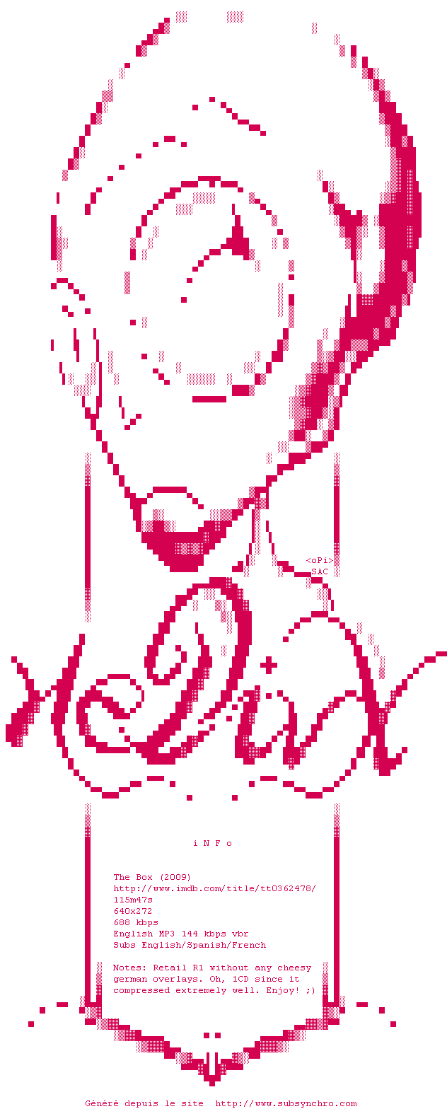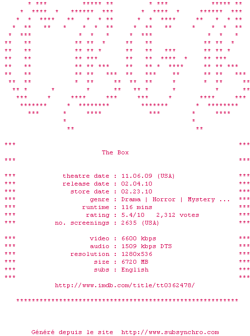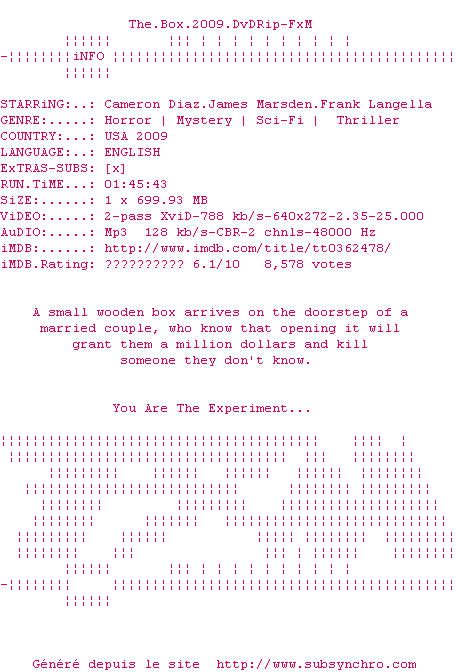 Le commentaire de Nuclear Commente par Nuclear (397), Le Dimanche 12 Aout 2012 à 16h10 A trop vouloir alimenter son récit en références philosophiques, Richard Kelly abandonne un peu son spectateur. Mais qu'à cela ne tienne ! L'audace de sa mise en scène pour tenter de mettre en image l'indicible est tout à fait remarquable. Chapeau ! 7 / 10 1 0