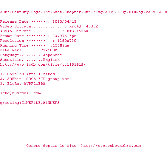 Voir le nfo de la release 20th.Century.Boys.The.Last.Chapter.Our.Flag.2009.1080p.BluRay.x264-LCHD