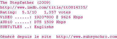 Voir le nfo de la release The.Stepfather.2009.UNRATED.1080p.BluRay.x264-CROSSBOW