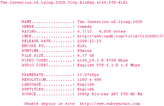Voir le nfo de la release The.Invention.of.Lying.2009.720p.BluRay.x264.DTS-WiKi